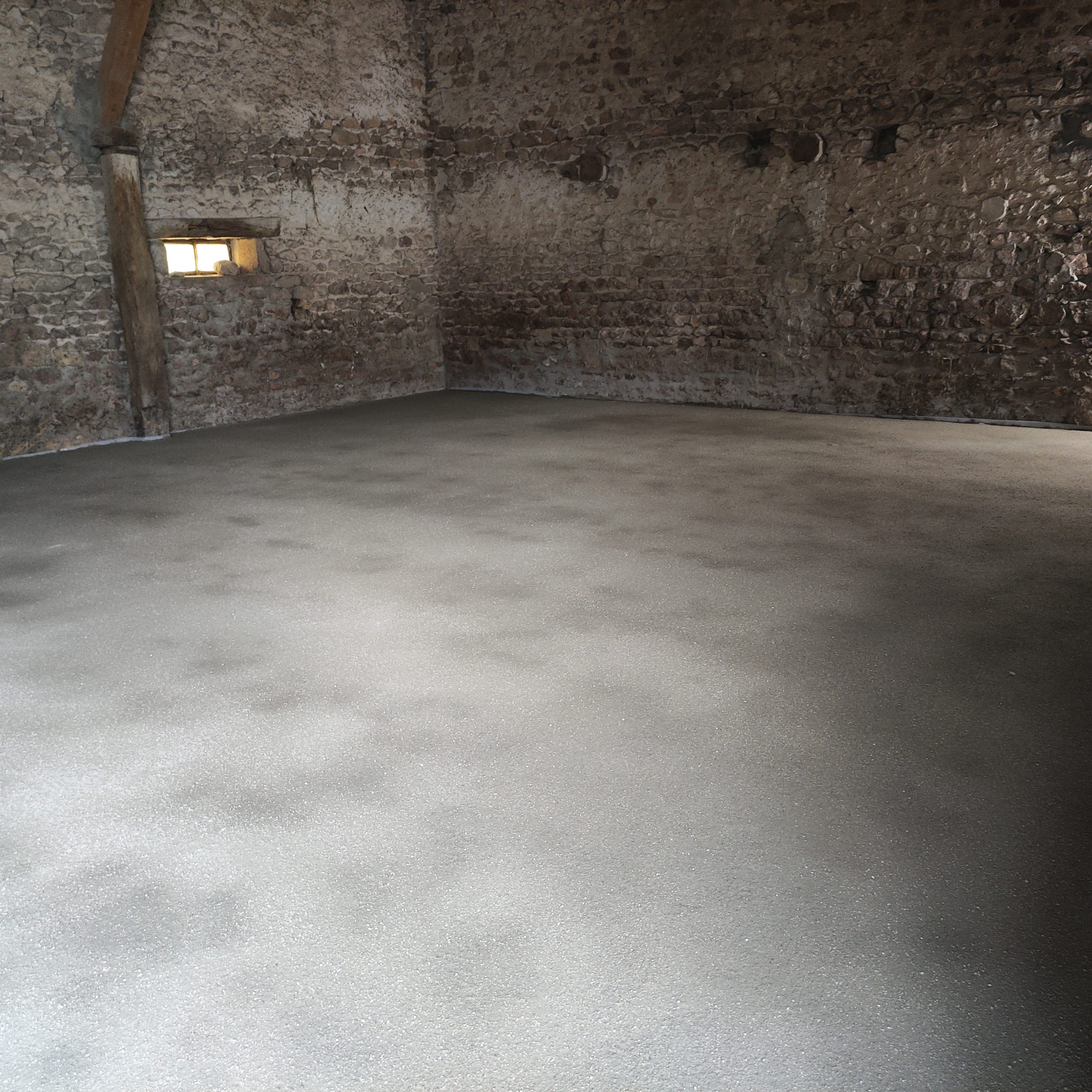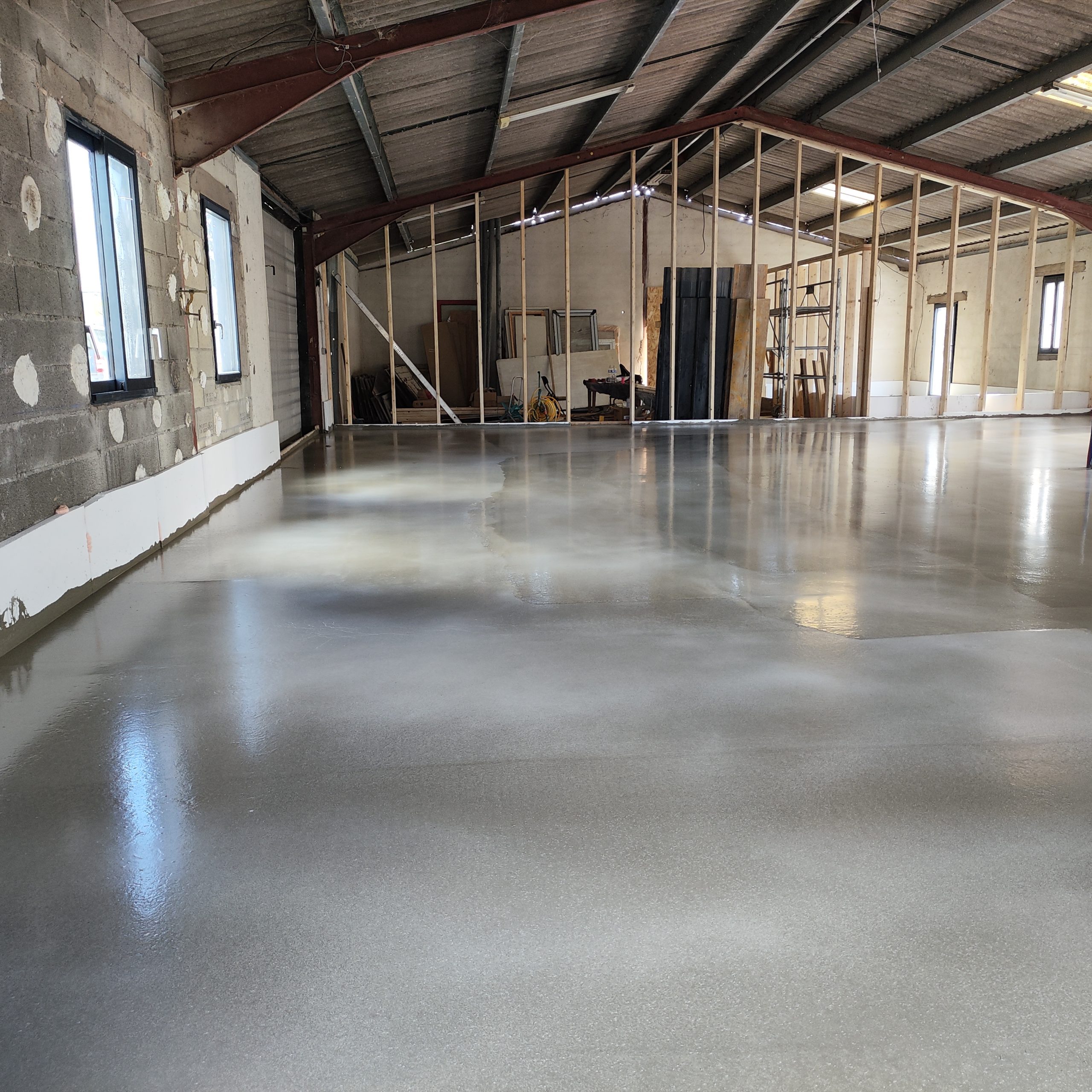 Béton quartzé : surface lisse, brillante et renforcée, parfaite pour un usage intensif (garages, ateliers, espaces commerciaux).